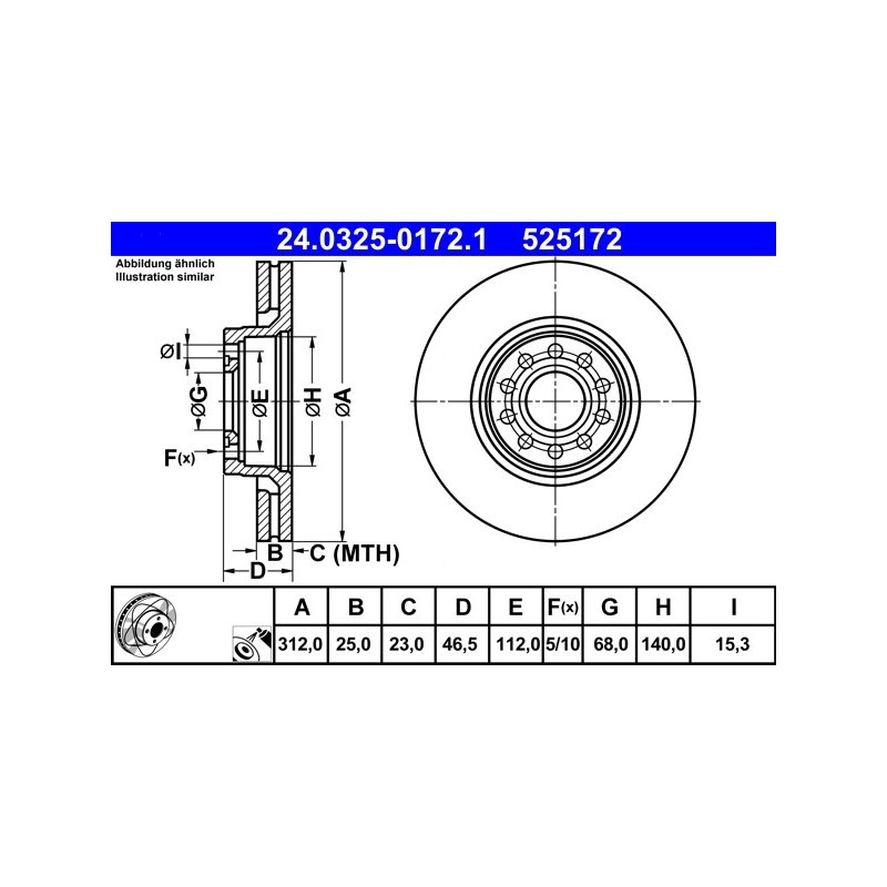 Produit : Disque de frein ATE 24.0325-0172.1 pour SKODA, VW SUPERB, PASSAT