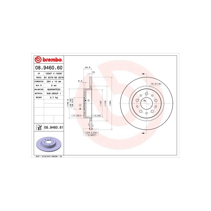 Commandez votre Disque de frein BREMBO 08.9460.61 sur eAuto Parts et bénéficiez d’un achat en toute sérénité, avec un droit de rétractation de 14 jours conformément à la réglementation en vigueur.