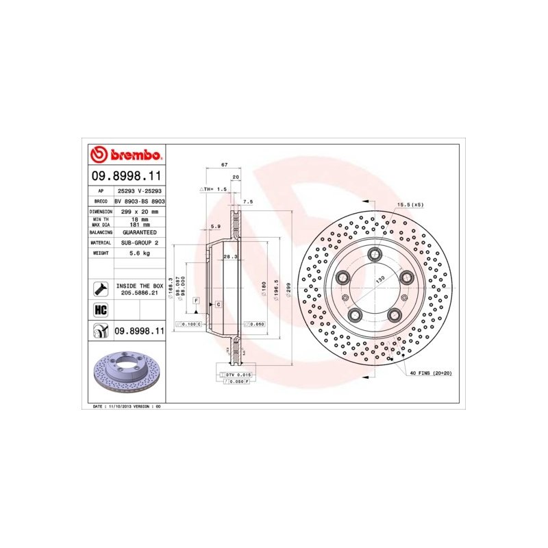 Ce Disque de frein BREMBO 09.8998.11 constitue une solution économique pour l’entretien ou la réparation de votre véhicule PORSCHE. Il s’agit d’une pièce équivalente OEM, compatible avec la référence constructeur , fabriquée par BREMBO conformément aux spécifications techniques d’origine.
