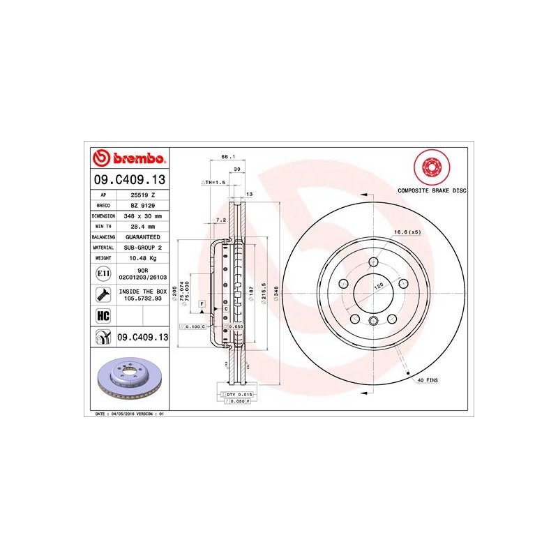 Disque de frein BREMBO 09.C409.13 pour BMW Série 5, 6, 7, référence d'origine 34106898723
