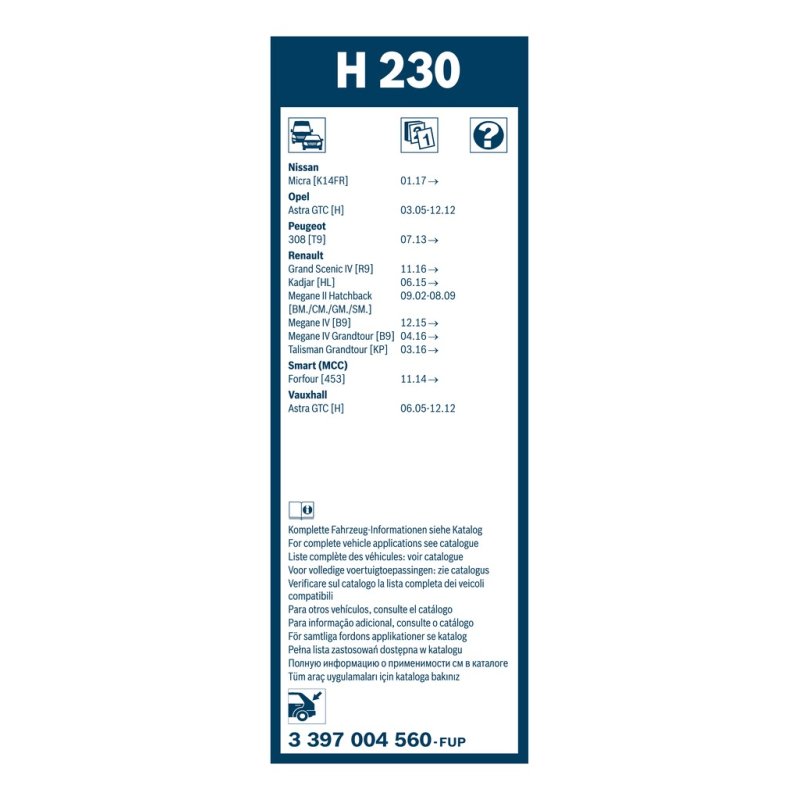Améliorez les performances et la fiabilité de votre véhicule avec ce Essuie glace arrière BOSCH de qualité Premium, conçu pour certains modèles NISSAN, OPEL, PEUGEOT, RENAULT, SMART, VAUXHALL. Ce produit constitue une solution fiable en tant que pièce équivalente OEM, compatible avec les spécifications d’origine du constructeur. Fabriqué par BOSCH, il répond aux exigences du secteur automobile.