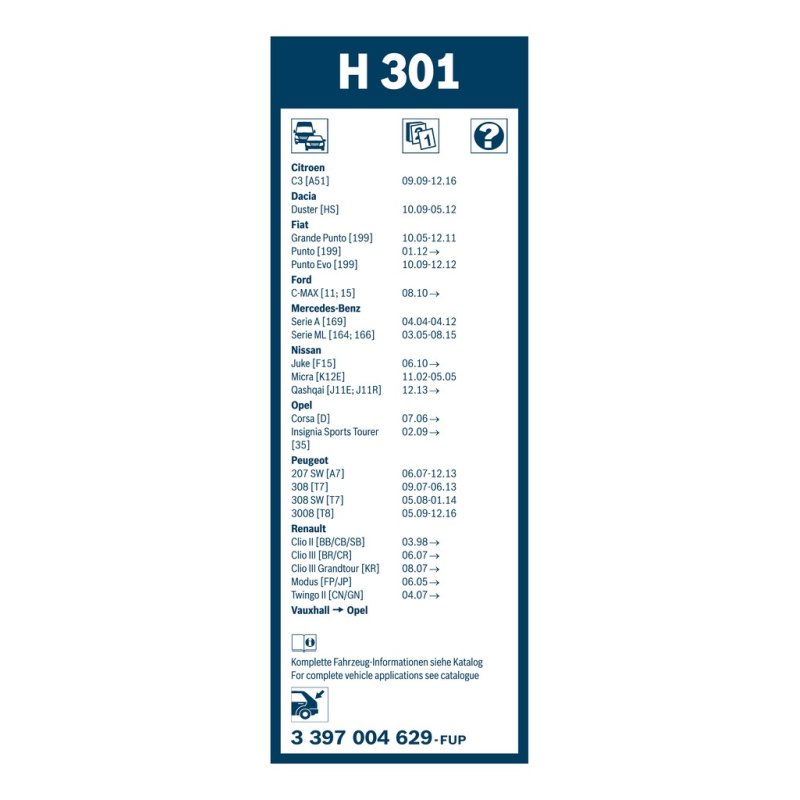 Ce Essuie glace arrière BOSCH constitue une solution économique pour l’entretien ou la réparation de votre véhicule ABARTH, ALFA ROMEO, CHEVROLET, CITROEN, DACIA, FIAT, FORD, FORD ASIA & OCEANIA, HONDA, HYUNDAI. Il s’agit d’une pièce équivalente OEM, compatible avec la référence constructeur , fabriquée par BOSCH conformément aux spécifications techniques d’origine.