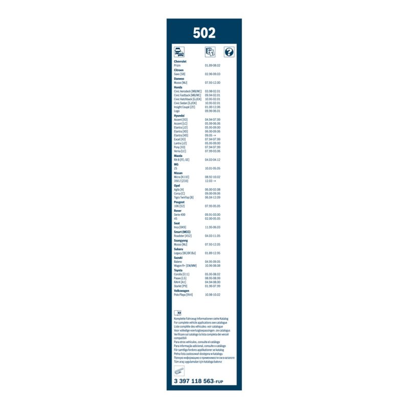 Chez eAuto Parts, nous proposons des pièces automobiles fiables et sélectionnées avec soin, comme ce Essuie glace BOSCH, conçu pour certains modèles CHEVROLET, CITROEN, DAEWOO, HONDA, HYUNDAI, MAZDA, MG, MITSUBISHI, NISSAN, OPEL. Cette pièce est équivalente OEM et compatible avec la référence constructeur , tout en respectant les spécifications techniques d’origine. Fabriquée par BOSCH, elle est identifiée sous la référence 3397118563EAN: 3165141087659.